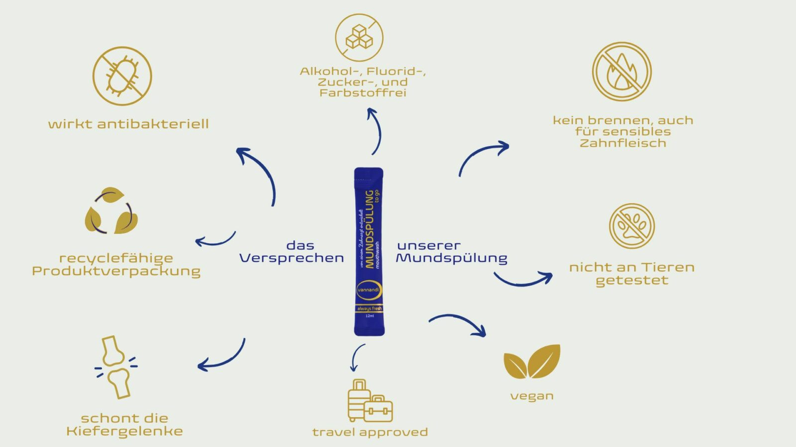 Bei vannandi steht Mundgesundheit im Mittelpunkt, daher haben wir, als Fachleute für Zahnheilkunde, eine praktische, hygienische und jederzeit verfügbare Einmalmundspülung, basierend auf wirkungsorientierter Formulierung, entwickelt.
